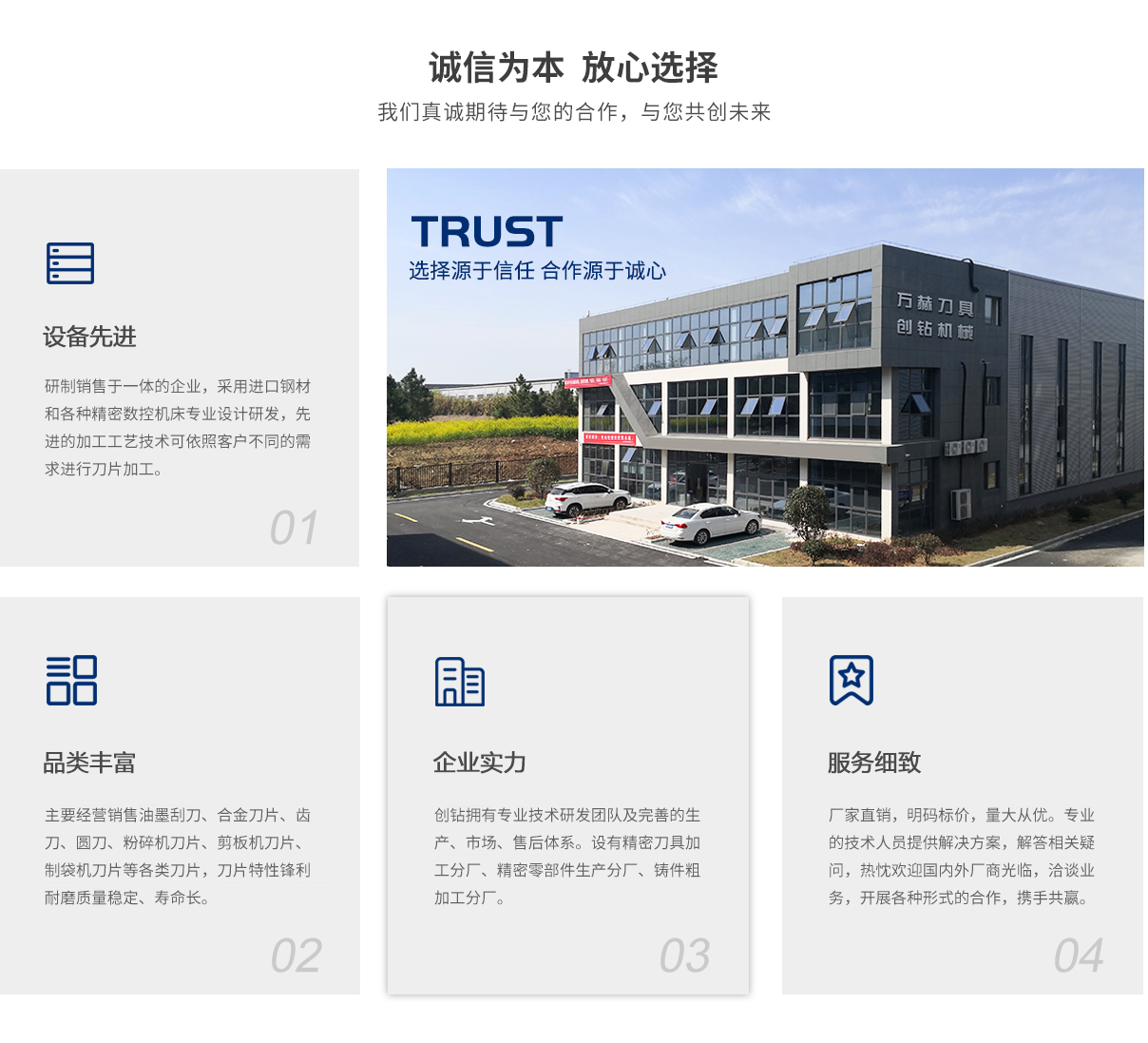 马鞍山创钻机械科技有限公司 INTRODUCTION 马鞍山市创钻机械科技有限公司(创钻机械)坐落于钢铁之城-安徽马鞍山,公司拥有专业的技术研发团队及完善的生产、市场、售后体系。公司设有精密刀具加工分厂、精密零部件生产分厂、铸件粗加工分厂,...